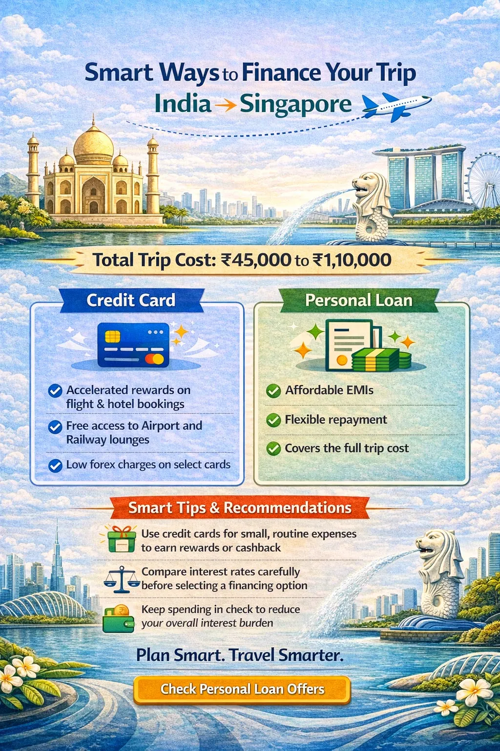 A travel loan could help you cover your Singapore travel cost without affecting your savings. Many lenders offer quick approval and flexible EMIs, especially for salaried individuals or business owners.