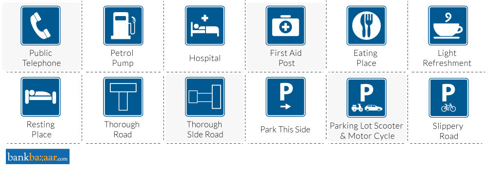 Informative signs serve to aid any drivers without a map or knowledge of the facilities available in the area they are driving in. They can help guide drivers by offering directions or telling them about hospitals, public phones, and parking spots in the area. Informative signs are displayed below.